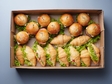 Кількість закусок 20 шт. Орієнтовна маса боксу 1500 грам.Склад: - Круасан "Цезаре" -10 шт.,- Міні бургер з яловичею котлетою, сиром та овочами - 10шт.